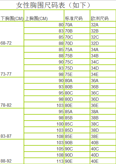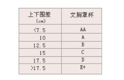 罩杯尺码=上胸围-下胸围 文胸一般分为AA、A、B、C、D、E六型,表示罩杯的深浅程度,每型之间的尺码区别由上、下胸围的差数决定。