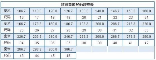 通过鞋子欧洲尺码和中国尺码可以做出鞋子欧码和中国码对照表。我们以中国码脚长的厘米数和欧洲码分别列出来做对比。