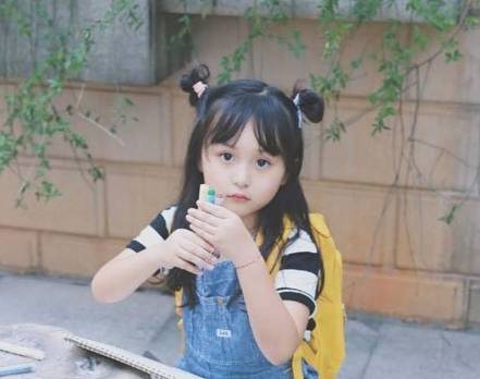 双扎的丸子头造型凌乱,带有几分动感俏皮的气息,女童的脸型有些圆润,看上去非常讨人喜欢。