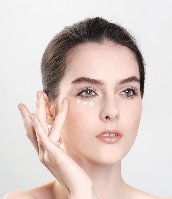 第二步 把眼霜均匀地点压在眼周的皮肤上,像弹钢琴一样沿着眼睛一周点涂上去,记住不要忽略细节部位,而且要着重涂在下眼窝和眼尾至太阳穴的部位。