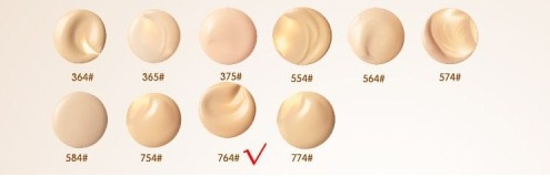 植村秀粉底液一共有十个色号:364、564、584、764、375、574、584、754、764、774