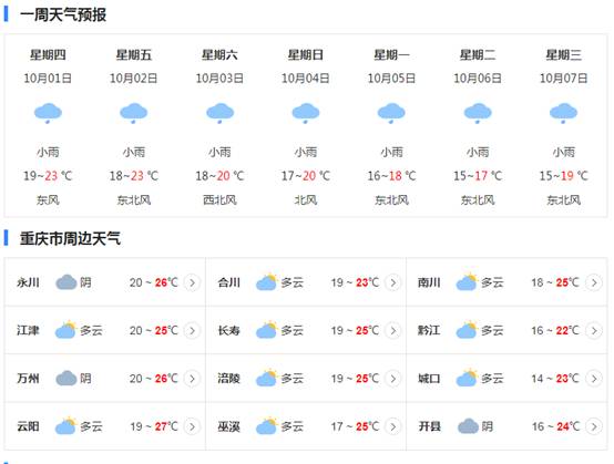 10月1日白天,大部地区阴天,部分地区间断小雨,夜间各地小雨到中雨,局地大雨,气温16~26℃。