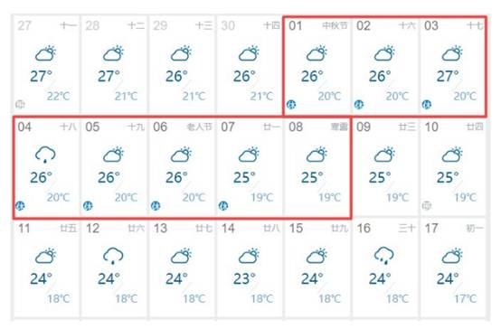 9月30日,大部地区阴天,偏西偏南地区间断小雨,气温15~26℃。