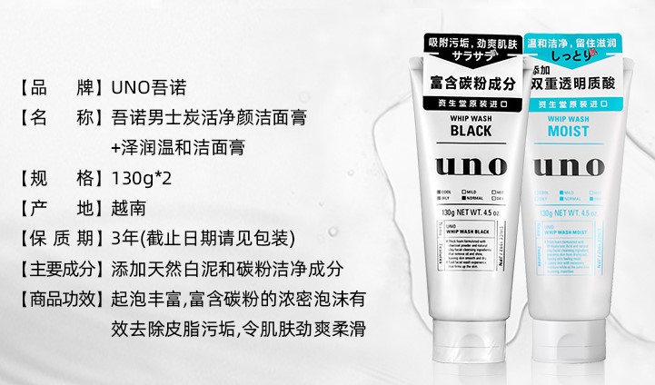 价格:55元,品名称:UNO/吾诺 活性炭吸油洗面奶,是否为特殊用途化妆品:否,功效:清洁,规格类型:正常规格,化妆品净含量:130g,品牌:UNO/吾诺,男士护理单品:活性炭吸油洗面奶。