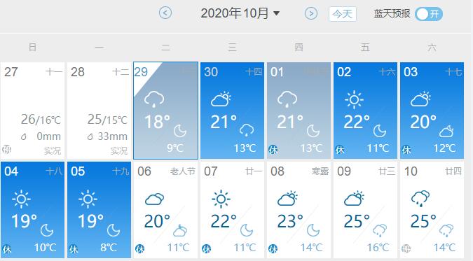 10月1日白天有三四级北风,阵风六级;10月5日夜间北部地区有小雨,南转北风。假期最温暖的一天为10月5日,最高气温25℃,最低温也有15℃。但6日马上变天,最高气温将跌至20℃,最低气温仅9℃。目前北京已进入秋季,季节转换,早晚较凉,市民要注意及时添加衣物,谨防感冒。