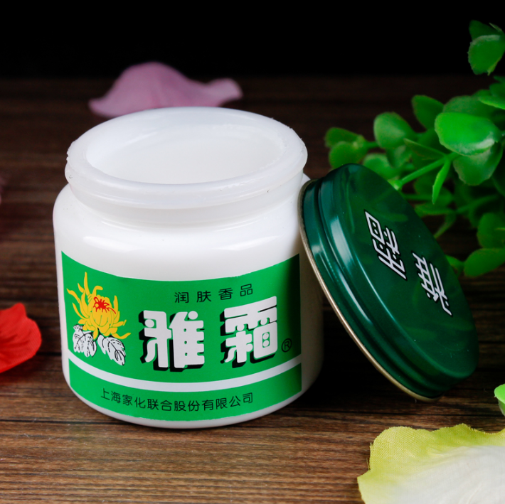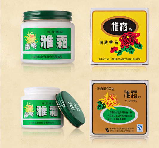 三四十年代,城市的街头到处都能看见雅霜的广告,上海家化生产的雅霜是中国最早有规模生产的化妆品之一,俗称"雪花膏",产地上海,并由上海"大陆药房"总经销。雪花膏搽在皮肤上会立即消失,与雪在皮肤上融化相似,故而得名。它是水和硬脂酸在碱的作用下进行乳化的产物。生产雪花膏的主要原料为硬脂酸、碱、水和香精。但为了使其有良好的保湿效果,常常添加甘油、山梨醇、丙二醇和聚乙二醇等。雪花膏的膏体应洁白细密,无粗颗粒,不刺激皮肤,香气味宜人,主要用作润肤、打粉底和剃须后用化妆品。