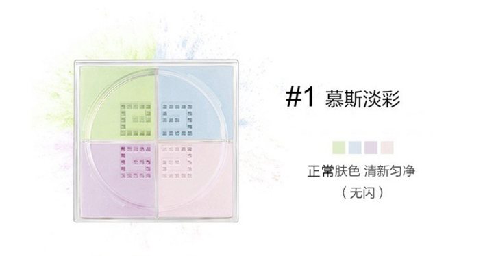 1号色慕斯淡彩:包含绿色、紫色、蓝色、白色的散粉颜色,能够帮助肌肤泛黄或是容易有红血丝的部位遮盖瑕疵,比较适合肤色较为白皙的妹子使用。
