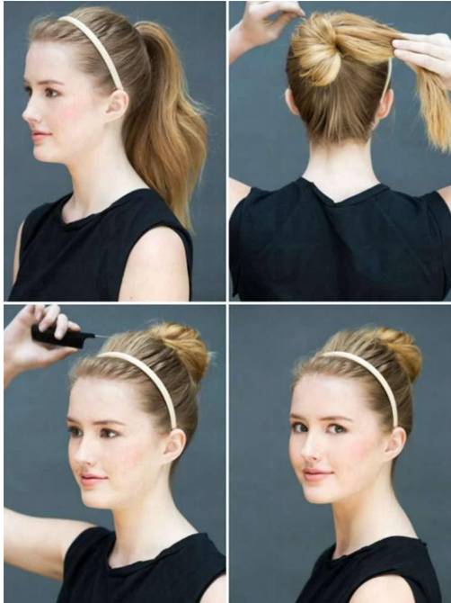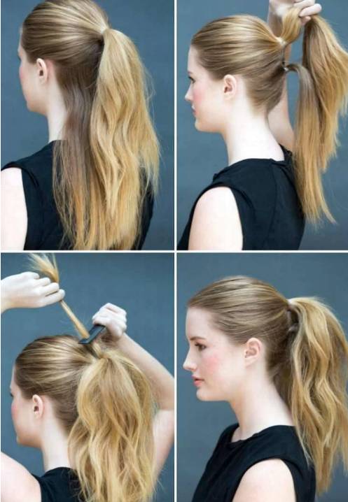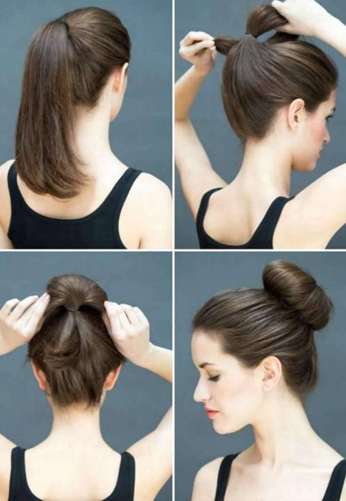 7. 绑一个高马尾,将发尾从中间穿过来,固定成丸子头。