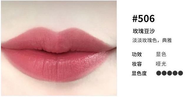 这款506最美豆沙色饱和度高、着色度较好。质地细滑,有保湿滋润的效果,可以让嘴唇水水嫩嫩一整天。