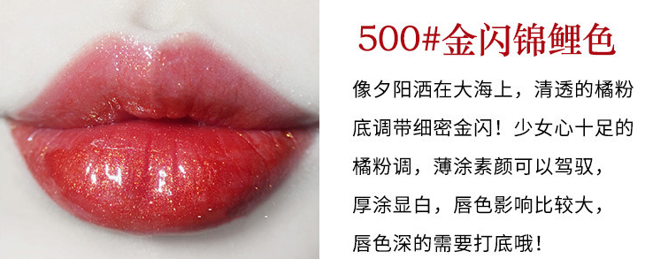 这款500粉橘锦鲤色与302橘红锦鲤色相比,颜色没有302橘红锦鲤色饱满。但是,这款色泽光滑,让人的气质更加端庄大气。
