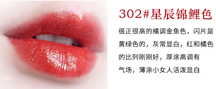这款302橘红锦鲤色与锦鲤颜色相同,有闪闪晶晶的凝亮感。而且,寓意大吉大利、万事顺心有种被幸运眷顾的感觉。