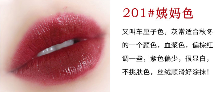 这款201姨妈色,滋润保湿效果极好,能够让肌肤看起来比较白皙。而且,这款任何场合都适用,让你无论在那个场合都是最后众人的焦点。