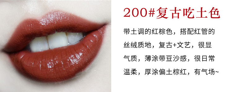 这款200红棕色哑光口红,质地细腻丝滑、上色效果极好。可以尽显成熟女性的迷人魅力,让你无论走在什么地方都能自信满满。