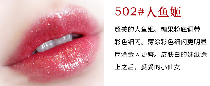这款502人鱼姬色,质地细腻、着色度高比较适合外出逛街使用。人鱼姬颜色,能够很好的提升肤色,让你自信一整天。