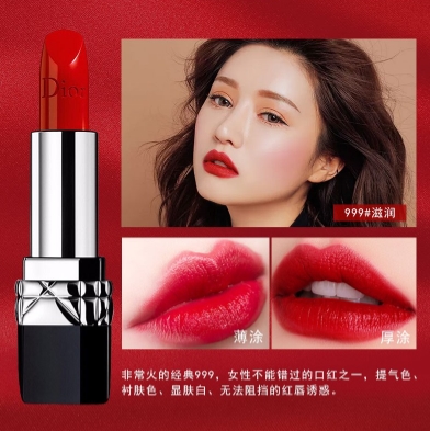 999是指迪奥999的口红,迪奥999饱满的正红色日常薄涂和厚涂都可以轻松驾驭,薄涂是偏玫红的,很日常,加厚几层那种正宫的气场就出来了,是那种正红是偏蓝调的红,就非常显白不挑皮;质地是特别的半哑光质地,整体感觉既有暖烘烘的日杂感,又有都市夜场蹦迪的金属感,虽然是半哑光质地,但是涂抹起来却非常顺滑。这款口红有6个版本,分别是迪奥999哑光版、滋润版、金属、夹心、新年限量、唇釉。