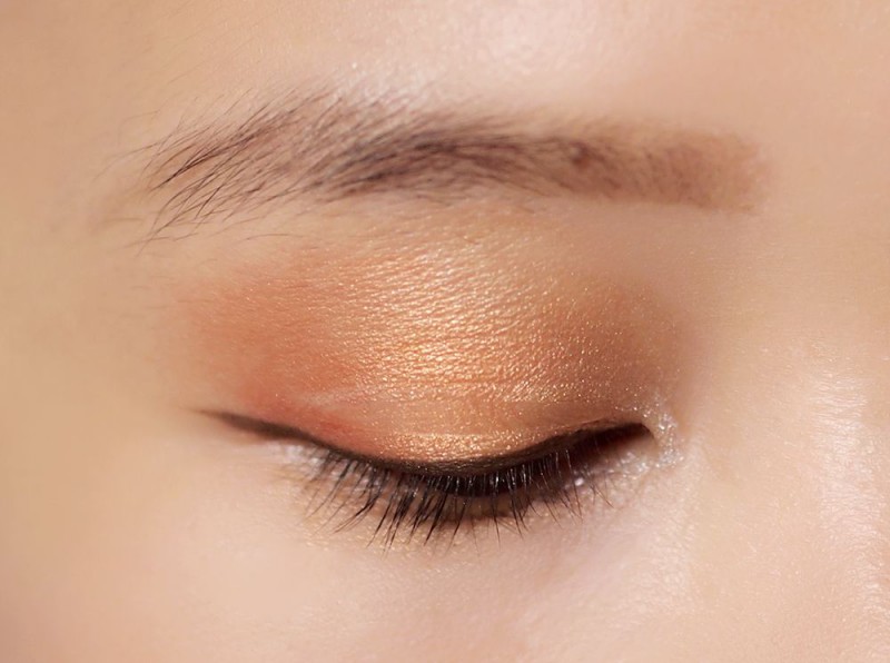 4. 让后把古铜色的眼影涂抹在眼窝处,并且使用眼影刷将其稍微晕染起来,这样能够让双眼皮胶的颜色遮掩起来,让双眼皮显得更加的逼真。