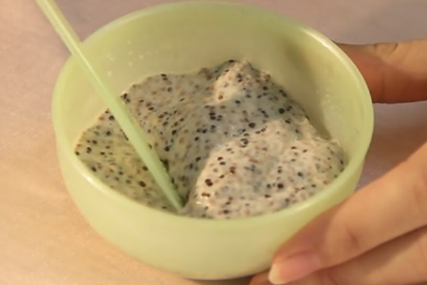 取两小勺海藻到小碗内,然后加入1:4的水(小勺海藻加4 小勺水),加水同时用面膜棒以打鸡蛋的方式搅拌。