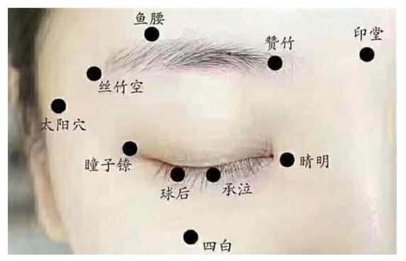 攒竹穴:在眉毛内侧端凹下处即是攒竹穴,按压有酸胀感。