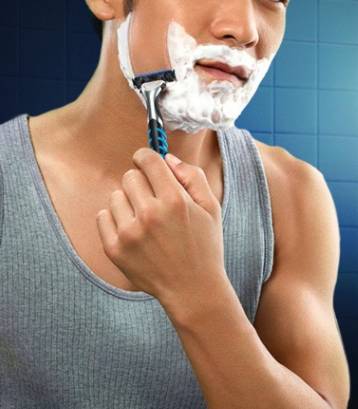 第二步:握住吉列威锋的手把,将刀片一端贴合在面部。
