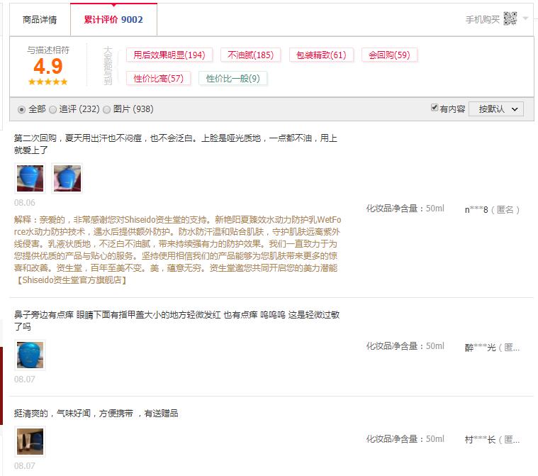 在天猫官方旗舰店中,大部分买家都表示资生堂新艳阳夏臻效水动力防晒乳用后效果明显、不油腻、包装精致、性价比较高,其中只有极小部分表示性价比一般。