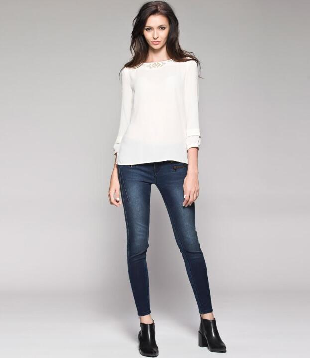 搭配二:雪纺上衣+小脚裤。雪纺上衣搭配小脚裤有上宽下窄的感觉,这种搭配方式有显瘦的效果,特别是黑色小脚裤,宽松的雪纺上衣搭配黑色小脚裤在配上一双黑色的鞋子,那美女们的长腿将会显现无疑。