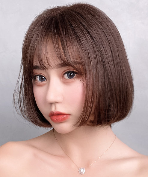 到肩膀的头发丰盈柔顺,中分梳理后打理成波波头造型,然后再用纹理烫打理出整个发型的自然蓬松感,两侧边发丝前置梳理后将脸庞侧边全部遮掩,这样就将脸庞修饰的小巧而秀美,温婉淑女气质由内而外的散发出来。