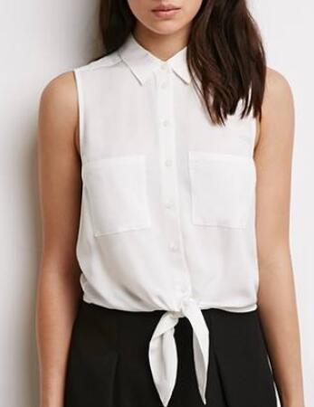 把衬衣的纽扣从上至下依次扣好,留下最下端的一颗或两颗,利用下端的长度在腰部位置打个结,这样可以增加整体的可看度与层次感,同时也能让你小露性感的小蛮腰哦。