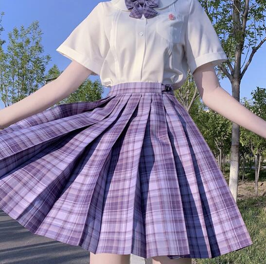 Jk裙可以搭配白色衬衫或者T恤、西装外套等。袜子可以穿长筒袜子,搭配马丁靴。