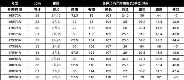 在裤子尺码对照表中找到牛仔裤尺码对应腰围尺数,乘上换算单位。换算单位是:一尺等于33.333333厘米。