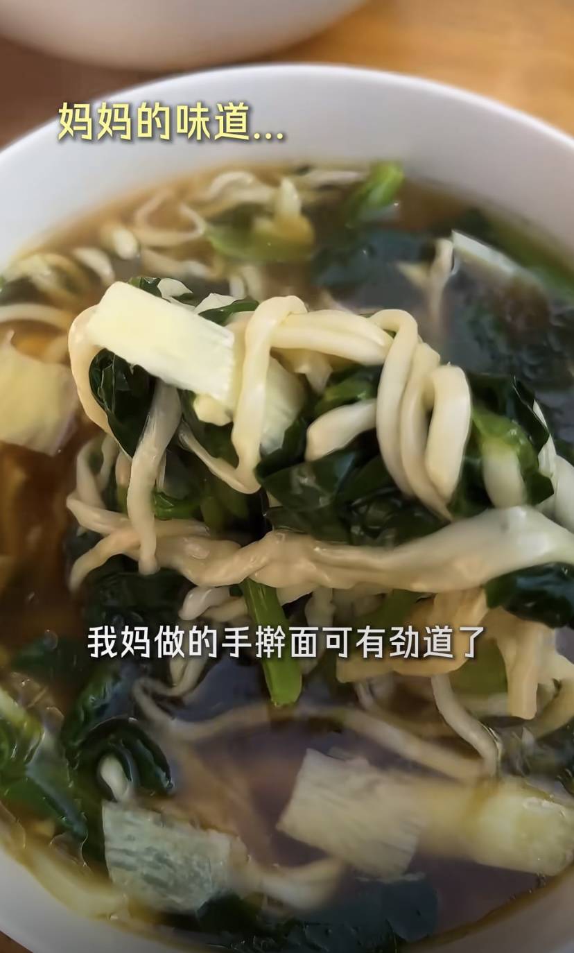回到家后,朱丹妈妈用新摘回来的菜,做了一晚手擀面。妈妈做的手擀面很筋道、添加了新鲜的青菜,吃起来特别满足。