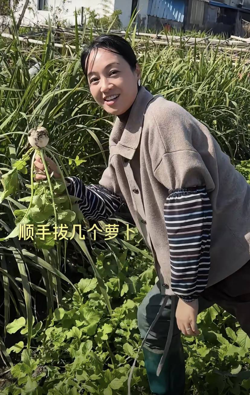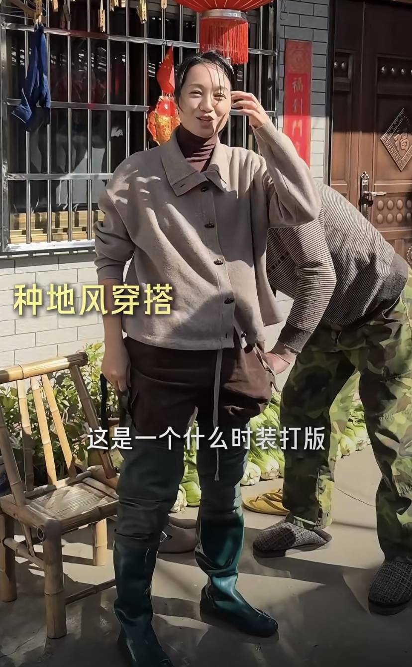 回老家的时候,朱丹打扮的很接地气。她没化妆、头发直接挽起来,穿着棕色羽绒服、宽松的工装裤,如果不是衣领上别着墨镜,这打扮和村里人没什么区别。
