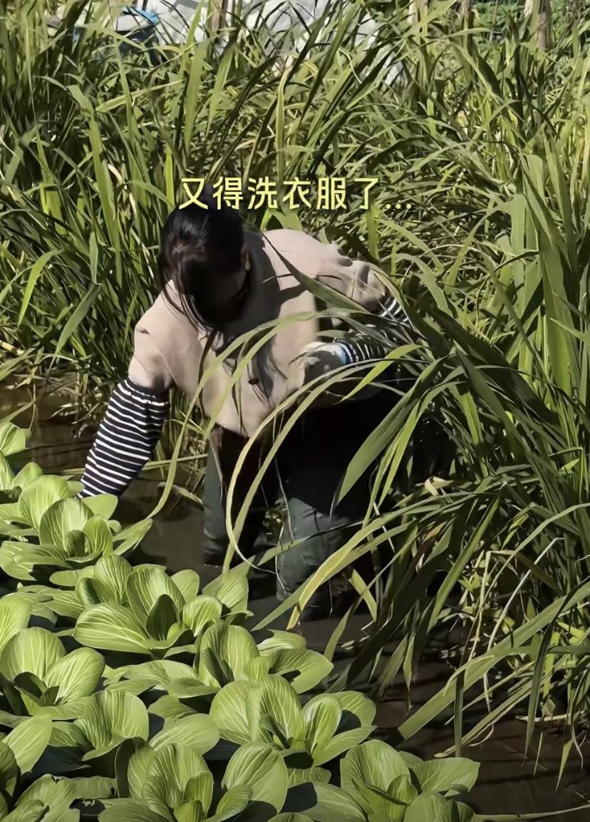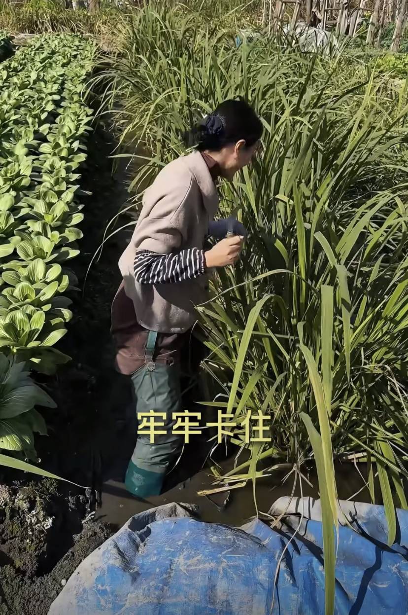 还有一个小插曲,就是在水田里剪茭白的时候,朱丹的脚被卡在了里面,怎么都拔不出脚。只能说朱丹不经常下地、力气不大够。