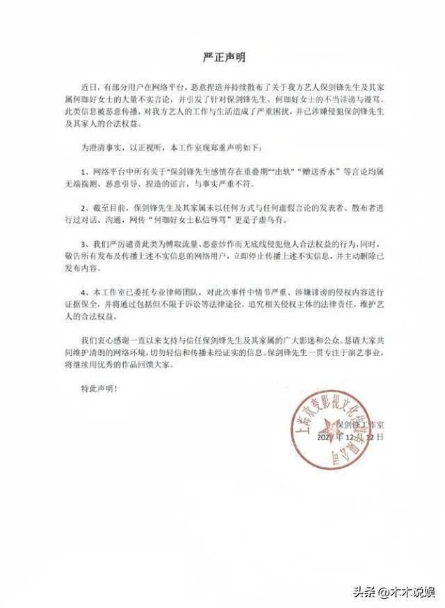 12月12号早上,保剑锋工作室发布声明,称网上流传的关于他出轨和送香水的说法都是虚假信息,并表示要追究造谣者的责任,同一天,保剑锋本人在微博上也发了一条动态,开头略带调侃地说“我都笑了”,但网友们注意到这条微博被修改了八次,于是大家开始猜测他可能因为心虚才反复改动。