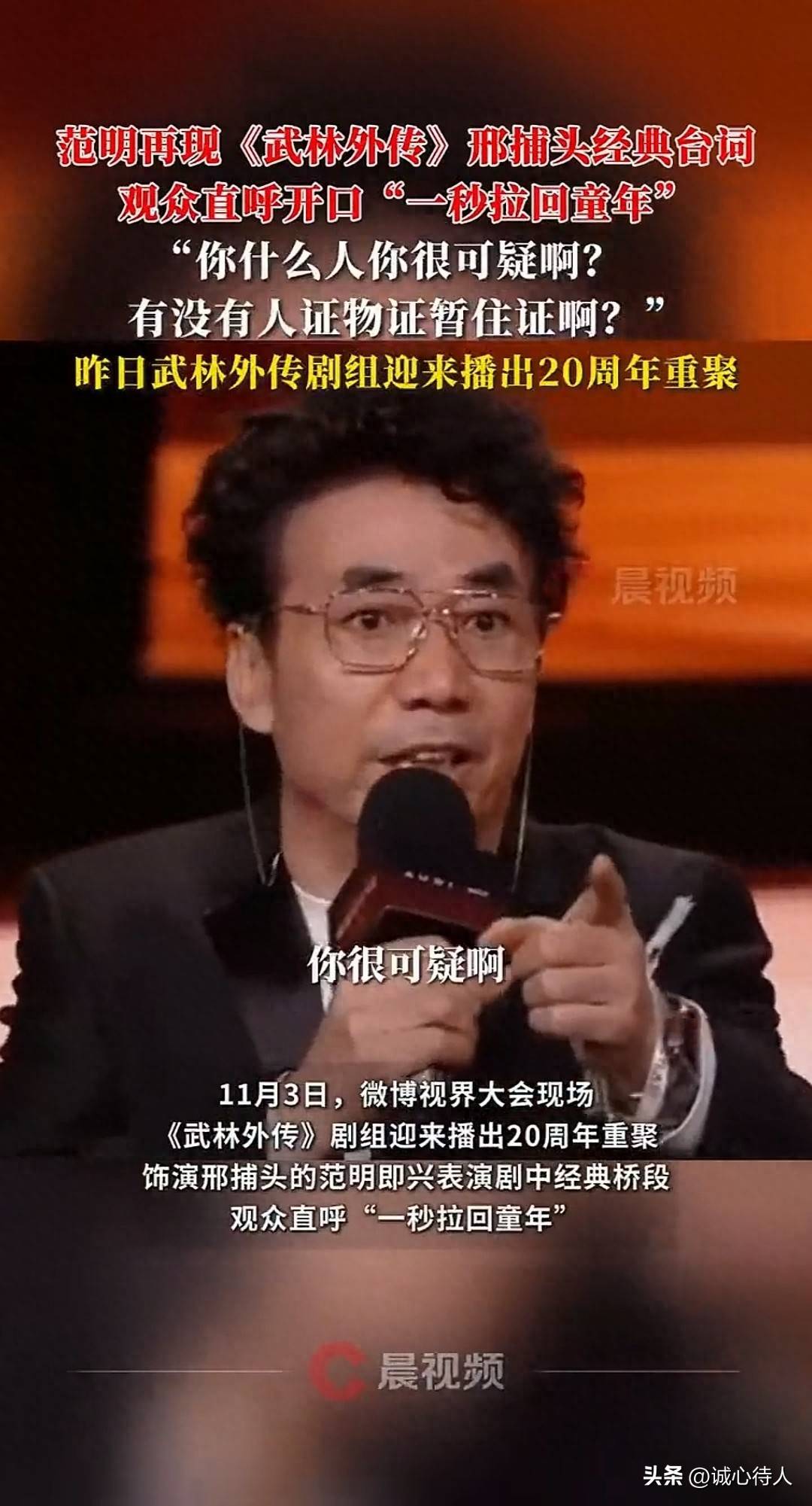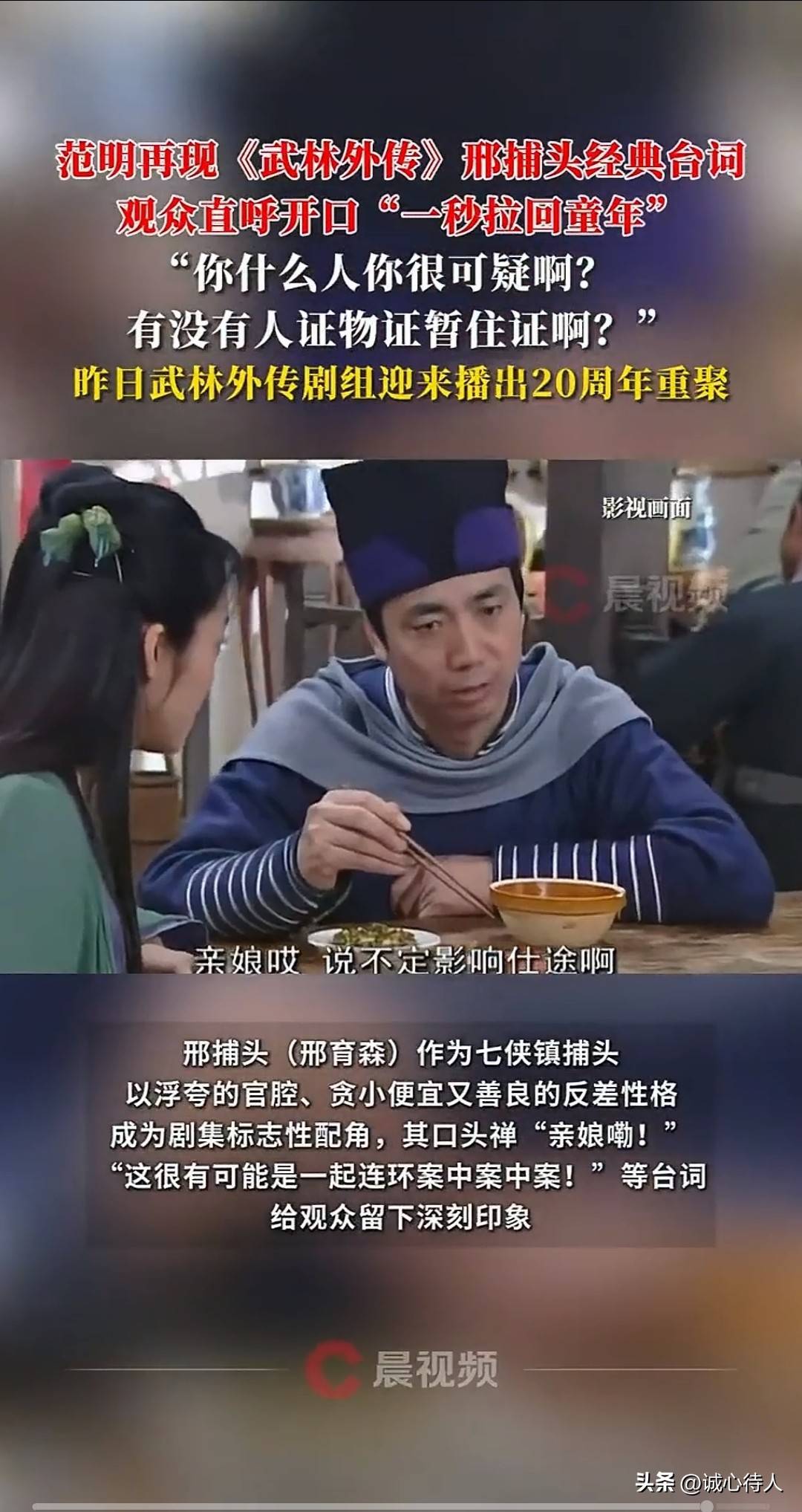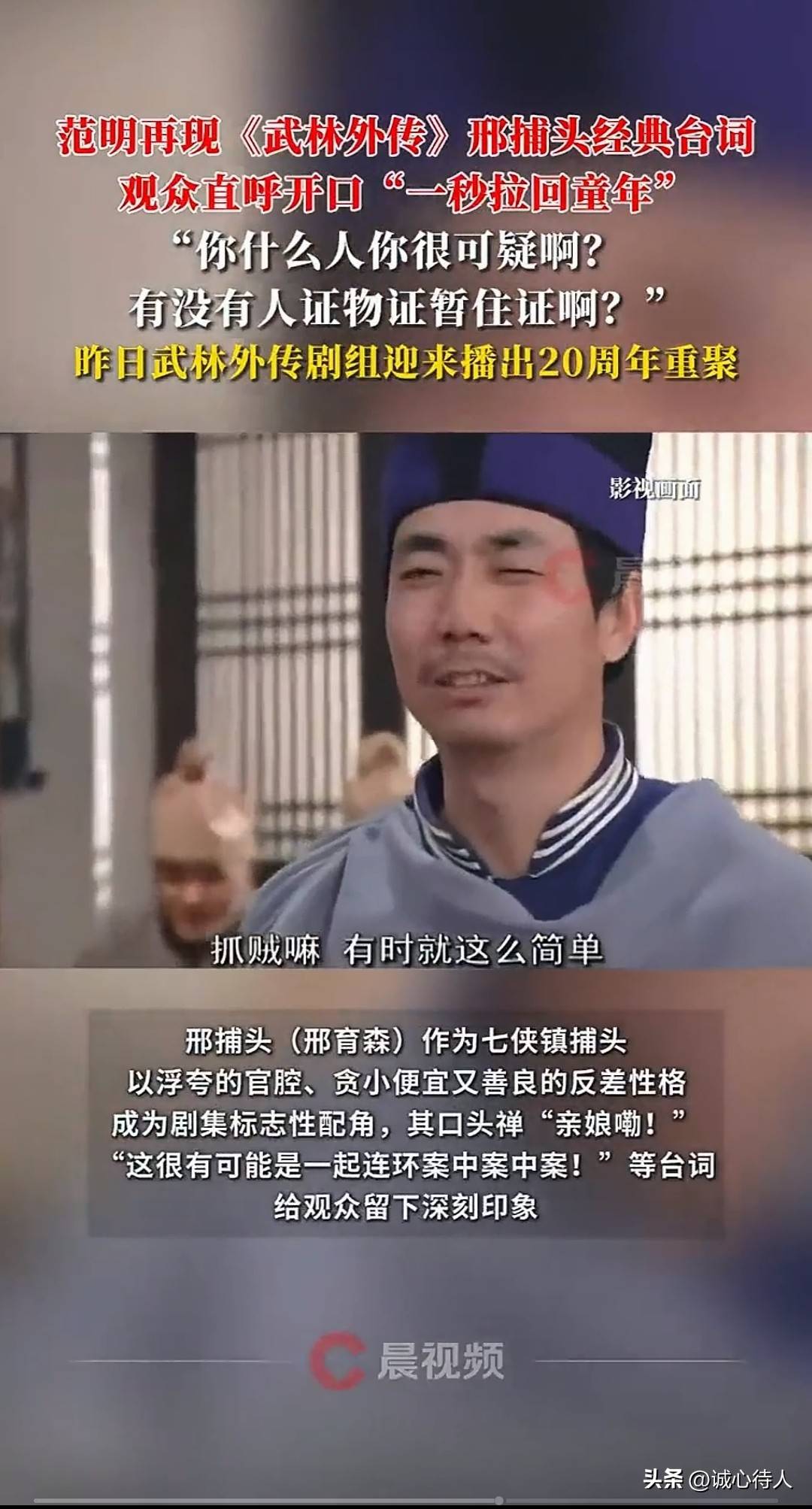 一句“你什么人你很可疑啊”,感觉一下子就把我们拉回了二十年前。范明老师的声音一出来,好像《武林外传》里那个说话拿腔拿调、又总想捞点好处的邢捕头,立马就笑嘻嘻地站到跟前了。昨天,剧组为了庆祝开播二十周年聚在了一起,就这简单一句话,不知道戳中了多少人的回忆。