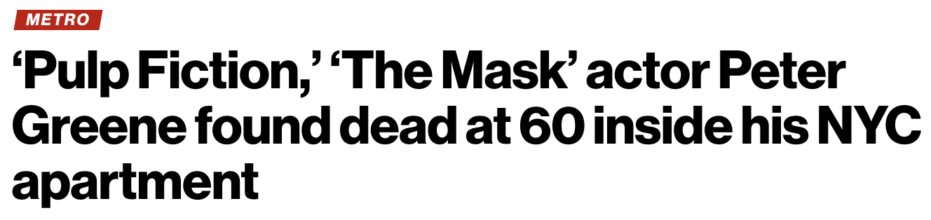 当地时间12月12日(周五)下午,以《变相怪杰》《低俗小说》等经典影片闻名的演员彼得·格林,在纽约下东区克林顿街的公寓中被发现死亡,终年60岁。