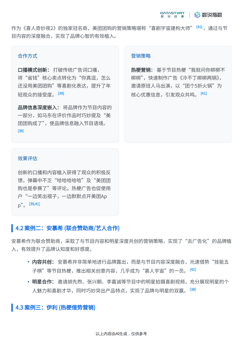 品牌联动方面亮点突出:总冠名商美团团购通过喜剧化口播、内容深度植入及热梗营销,实现品牌与节目深度绑定;安慕希以内容共创和明星合作实现“去广告化”植入;伊利借势“牛爷爷”热梗推出情感共鸣型广告;DQ则通过非官方联动,将网友创意转化为官方活动,实现销量翻倍。