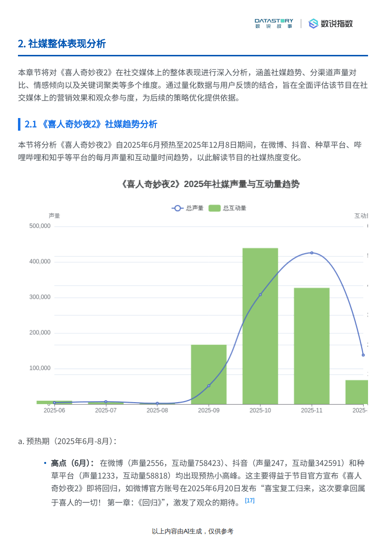 节目社媒热度呈现清晰的阶段性特征。6月预热期凭借官方回归宣告引发小高峰,8月进入平静期;9月开播后,各平台声量与互动量爆发式增长,微博声量从8月的988飙升至30502;10月迎来峰值,抖音互动量高达4905万,核心驱动力是“技能五子棋”等爆款作品的裂变传播;11月微博声量创下37.07万新高,热度持续高位;12月收官阶段虽有回落,但总决赛相关讨论仍维持高热度。