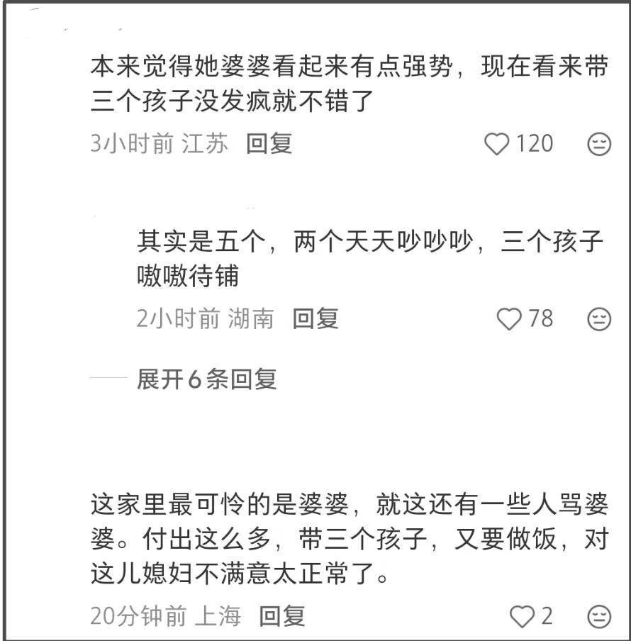 大家这才回过味来,仔细咂摸起婆婆当初那些“大实话”。原来,这位被贴上“恶婆婆”标签的老人,一个人默默扛下了多少重担。她不仅要照顾三个活蹦乱跳的孙辈,还得操心儿子儿媳的一日三餐。做好了早饭,儿媳可能还蒙头大睡;等到午饭晚饭点儿,她又得张罗下一顿。何美延自己也承认,时常在家一躺就是一整天,床都懒得起。这么一看,婆婆口中那句“她不太管孩子”,哪里是抹黑,分明是客气又无奈的事实陈述,甚至还在给儿媳留面子呢。