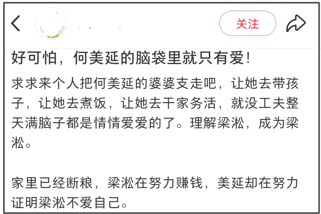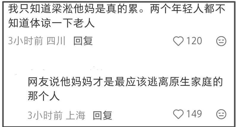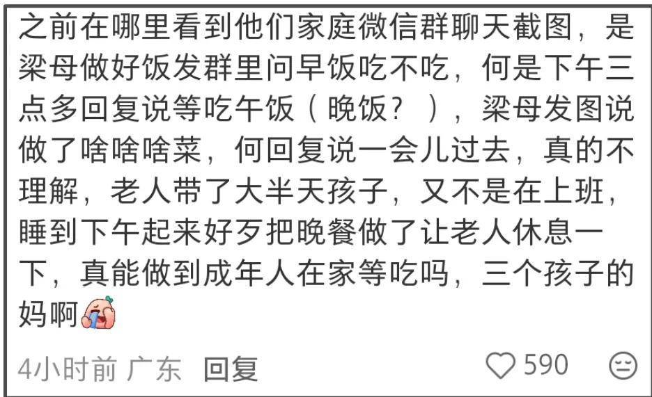 更让人感慨的是那个一度火上热搜的“争外套事件”。当时大家都觉得梁淞对妻子不够温柔体贴,可如今回头再看,何美延在整件事乃至整个婚姻里,似乎都像个没长大的、需要被全方位照顾的“小女孩”,而不是三个孩子的母亲。当然啦,梁淞的问题也一点不少,作为丈夫和父亲,他的担当同样缺席。这对小夫妻,仿佛还停留在恋爱的梦幻泡泡里,却把婚姻中最实在、最沉重的育儿责任,一股脑儿地转移到了老母亲瘦弱的肩膀上。