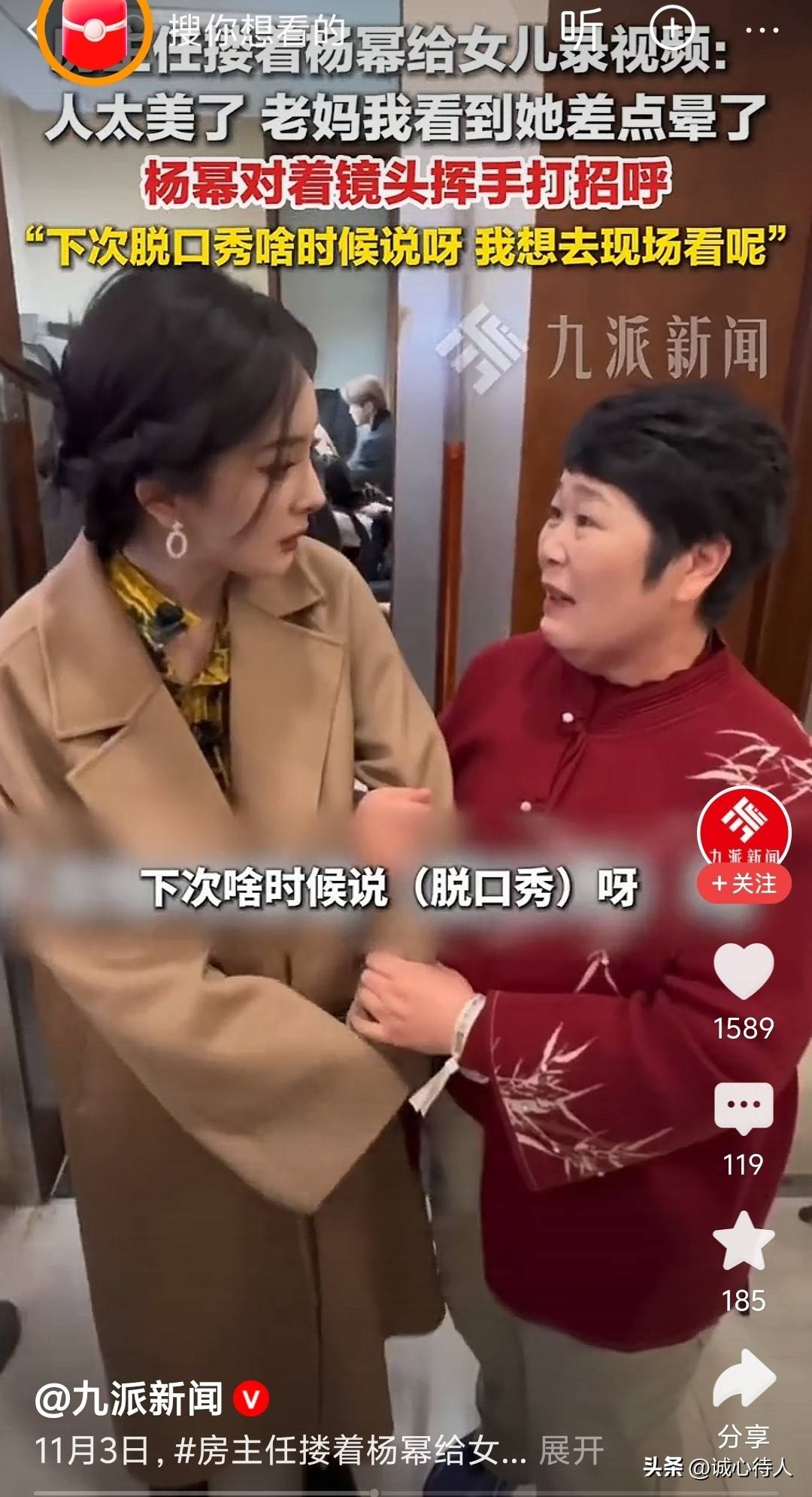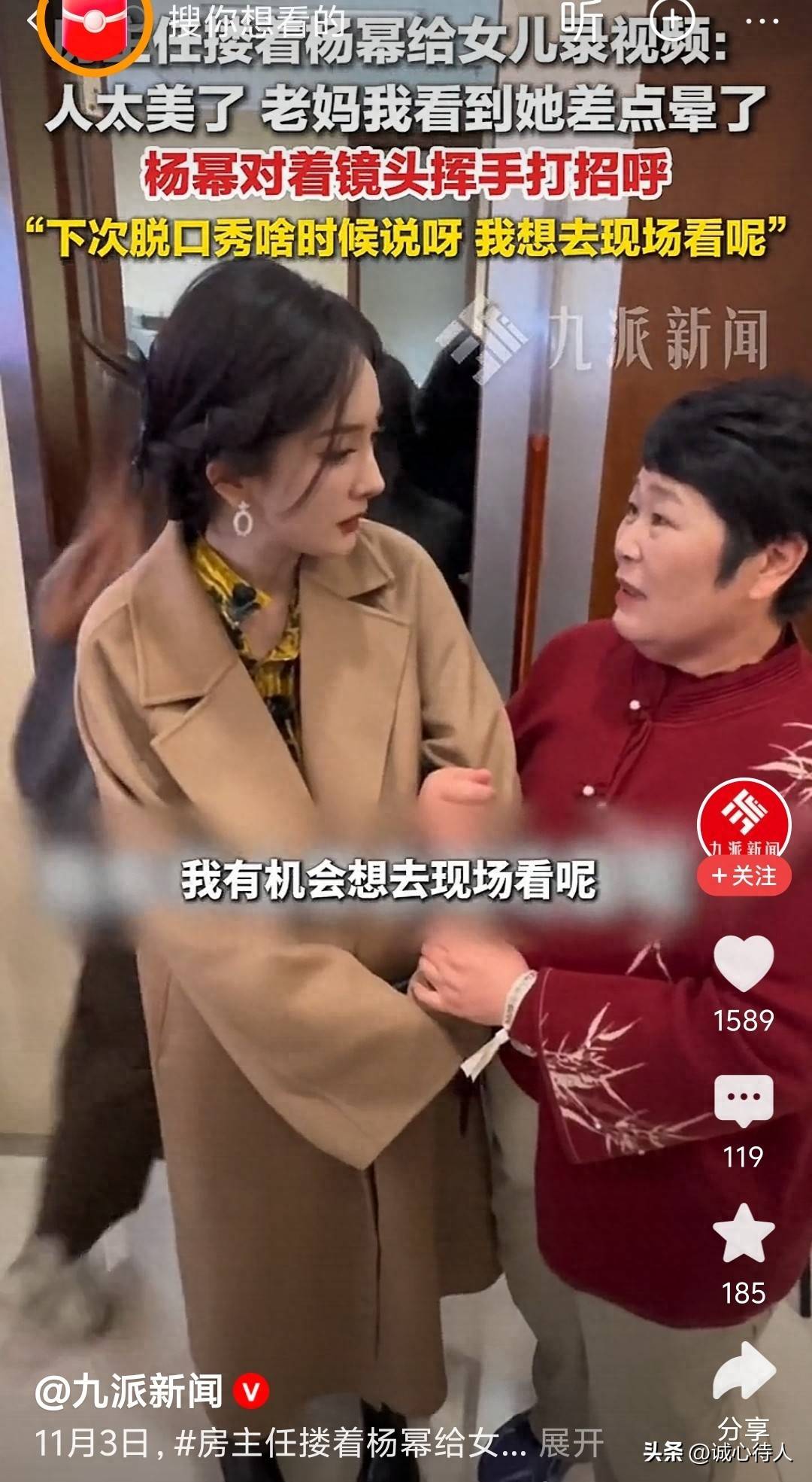 一张普通的视频截图,突然在网络上火了起来。11月3日,有位昵称叫“房主任”的父亲,碰见了演员杨幂,还搂着她一起给自己女儿录了一段视频。这个有点可爱又有点搞笑的互动,让很多看到的人都忍不住跟着笑了。