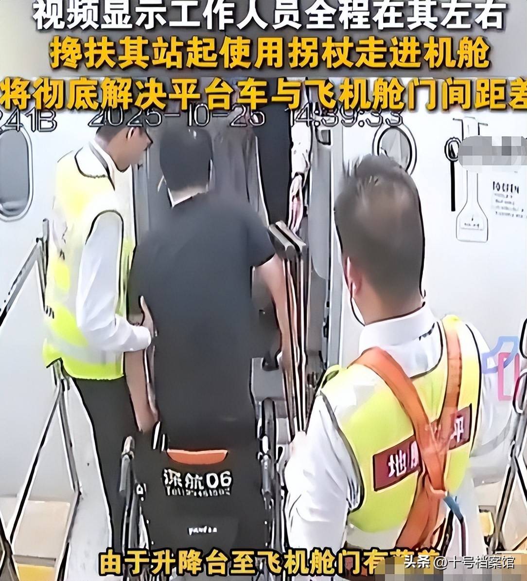 可没想到,事情很快有了变化。网上流出了一段他当时登机的现场视频。从视频里看,并不是“连滚带爬”那么惨烈,相反,有好几位机场工作人员在忙前忙后,搀扶他,搬运轮椅,协助他上了飞机。
