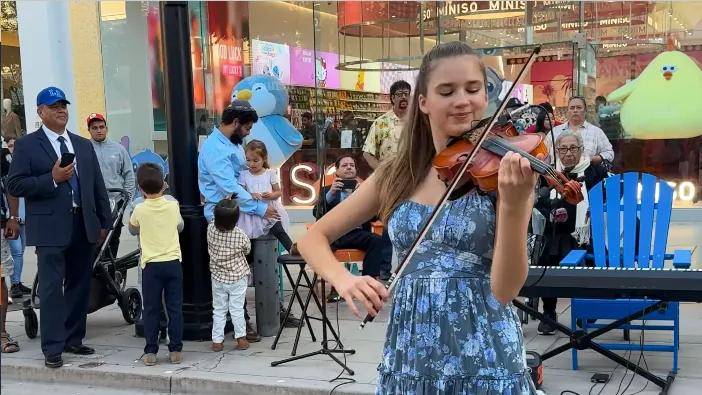 Karolina Protsenko像往常一样在街头演奏音乐,这时,一位陌生女孩上前,询问她能否演奏古典音乐作品,一番沟通后,二人决定合作演绎《四季·冬》,Karolina Protsenko全情投入拉琴,陌生女孩则用钢琴与之配合,她们的演奏十分默契,节奏把控得恰到好处,原本熙熙攘攘的街头,渐渐安静下来,玩耍的孩子们停下脚步,好奇地张望,游客们也停下匆忙的脚步,静静聆听。