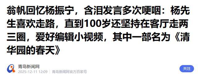 她说的第一件事,是一件听起来有点“日常得过头”的小事,“杨先生晚年走路很慢,但每天一定要在清华园走一圈。”