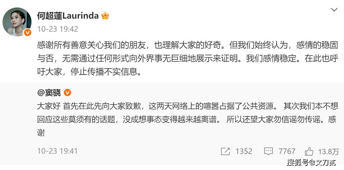 众所周知,前段时间何超莲和窦骁闹离婚的传闻甚嚣尘上。当时,窦骁还在剧组拍戏,随着传闻迅速发酵,身在剧组的他也第一时间给出了回应,发文表示“本不想回应这些莫须有的话题,没想到事态变得越来越离谱,望大家勿信谣勿传谣”。随后,何超莲也转发了这条动态,直言“感情的稳固与否,无需通过任何形式向外界事无巨细地展示来证明”。