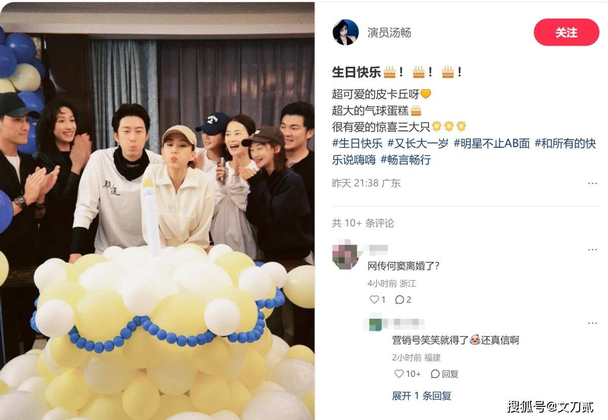 婚变的导火索源于生日,现在打破二人婚变传闻的甜蜜合照也是因为生日。近日,窦骁37岁的生日到了,演员汤畅发出了他们夫妻二人合体庆生的照片,两个人甜蜜互动,眼神有爱。何超莲生日的时候,窦骁在拍戏;这回窦骁生日,他本人尚未进组,何超莲更是从生日前一天就陪伴在他身边。