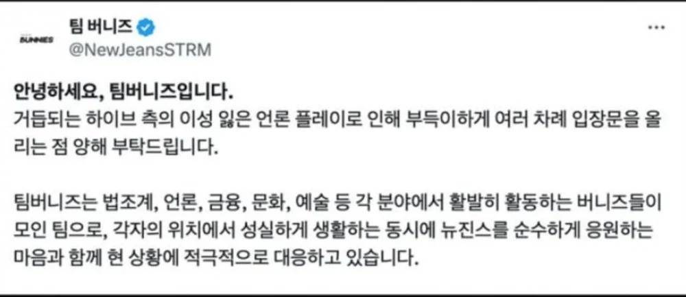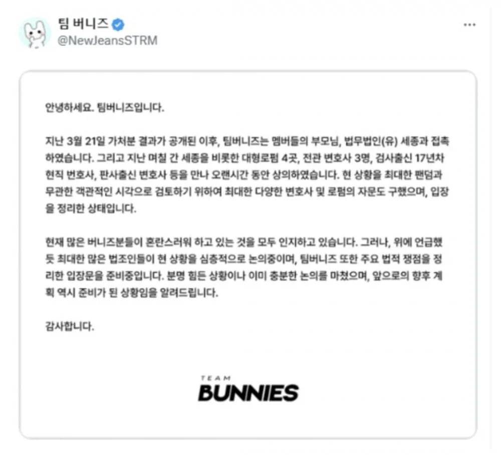 “Team Bunnies”并非普通粉丝社群。自去年9月开始活动以来,该团体便以“由法律、媒体、金融等多领域专业人士组成的Bunnies(NewJeans粉丝名)团队”自居,展现出高度的组织性和行动力。其与Belift Lab的对抗早有伏笔:去年11月,在Belift Lab CEO金泰浩公开强调ILLIT与NewJeans概念“完全不同”后,“Team Bunnies”反手就以涉嫌业务妨害等罪名对金泰浩提起了刑事控告,态度强硬。