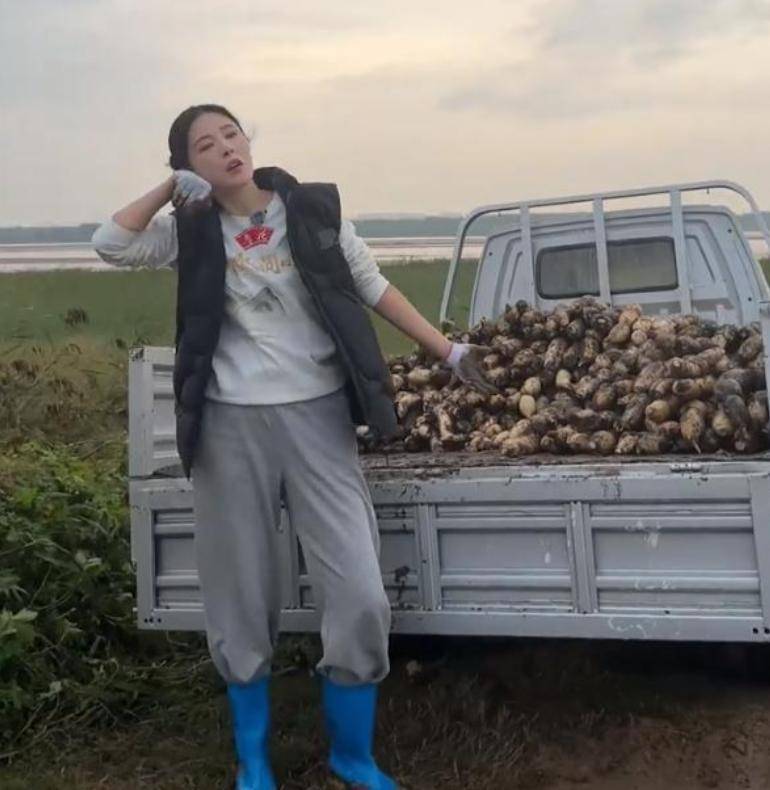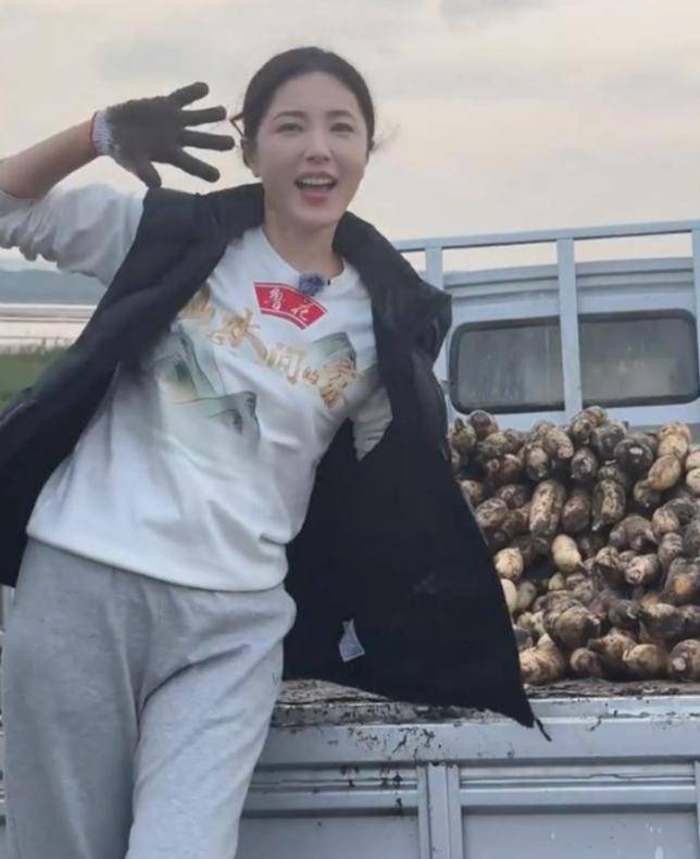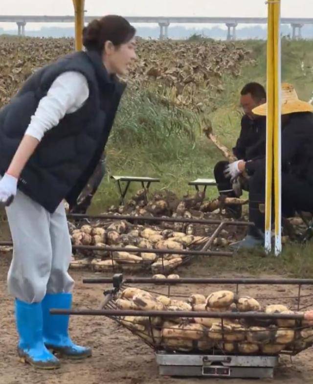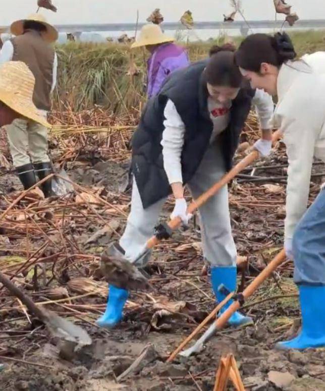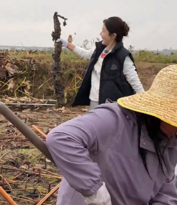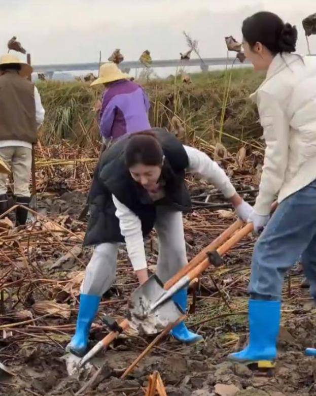 可能干着干着就习惯了,觉得这日子也挺好的,最近她又回去了,这回是奔着挖莲藕去的,那天还下雨,她也不讲究,雨衣胶鞋往身上一套就出门了,穿得特别随便,要不是知道她是明星,光看打扮真就是个下地干活的农村妇女