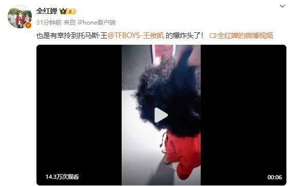12月15日,全红婵在社交平台发布与王俊凯合拍的视频,并配文:也是有幸拎到托马斯·王@TFBOYS-王俊凯的爆炸头了!两人神仙友谊让网友直呼羡慕!