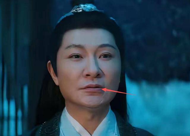 镜头里是蓝色背景配一身蓝布衣,色调本来够阴冷了,结果正脸一露,那张脸肿得像刚出锅的发面馒头,饱满得特别不自然,连额头都亮得反光。