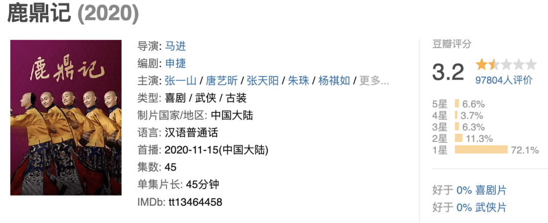 张一山演的韦小宝,没有机灵圆滑,只有五官乱飞的浮夸,像个猴子附体的木偶。
